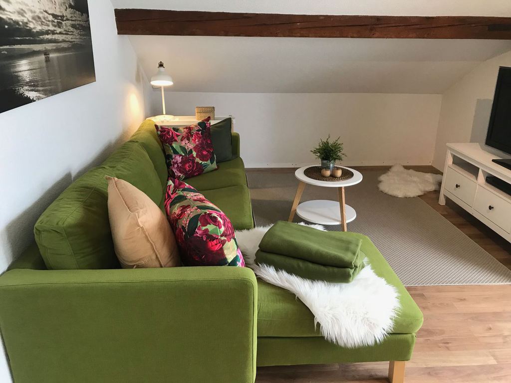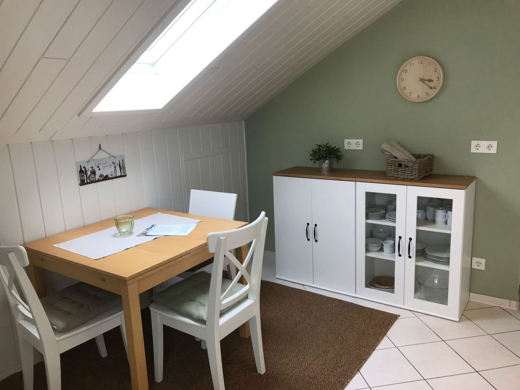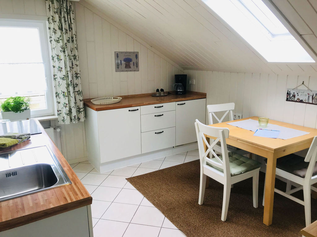 Die sehr gut ausgestattete und geräumige Wohn-Küche hat einen Essplatz bis 4 Personen. Sie ist ausgestattet mit Spülmaschine, Ceranfeld, Backofen, Kaffeemaschine, Wasserkocher und Toaster.