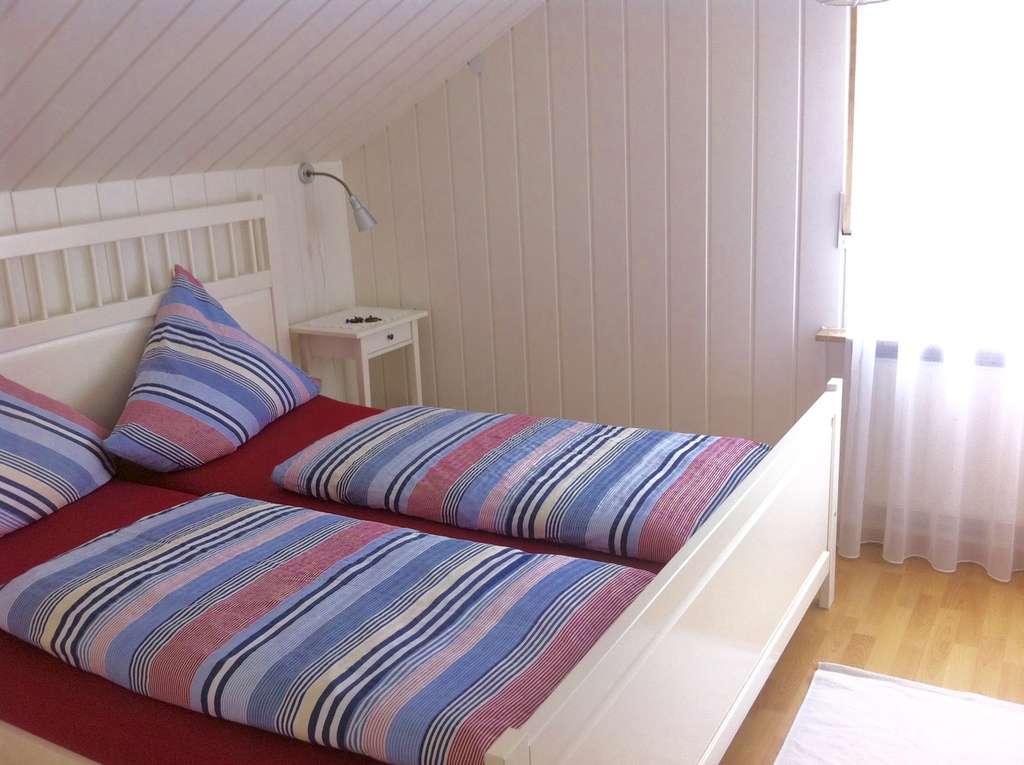 Das Schlafzimmer hat ein Doppelbett und einen Einbauschrank.