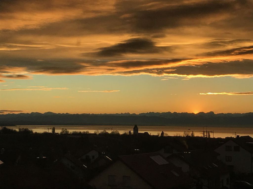 Das Wohnzimmer mit Balkon bietet einen herrlichen Blick auf den Bodensee und die Alpen.
